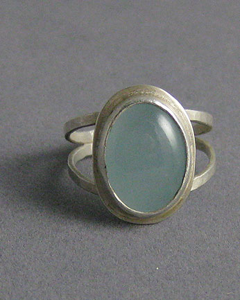 This ring features a large translucent aquamarine cabochon in an Argentium sterling silver setting with a matte finish. Size 7.