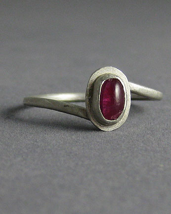 This delicate ring has a translucent ruby cabochon in an Argentium sterling silver setting with a matte finish. Size 7.