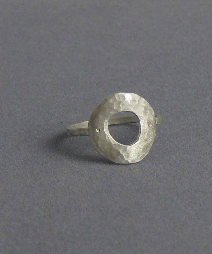 This Argentium sterling silver ring consists of a hammered open silver circle on top of a thin band.
