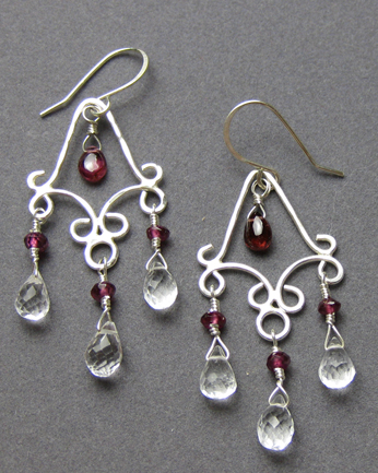 These triangular chandelier earrings showcase a smooth red spinel drop in the center and rhodolite garnet beads with colorless topaz briolettes.